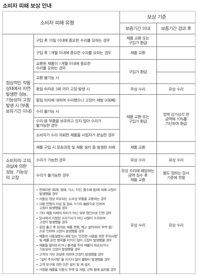 정상적인 사용 중 발생한 고장인지, 소비자 과실인지, 부품 보유 여부에 따라 보상 방식이 달라지는데요, 아래 기준표를 확인해 보세요.